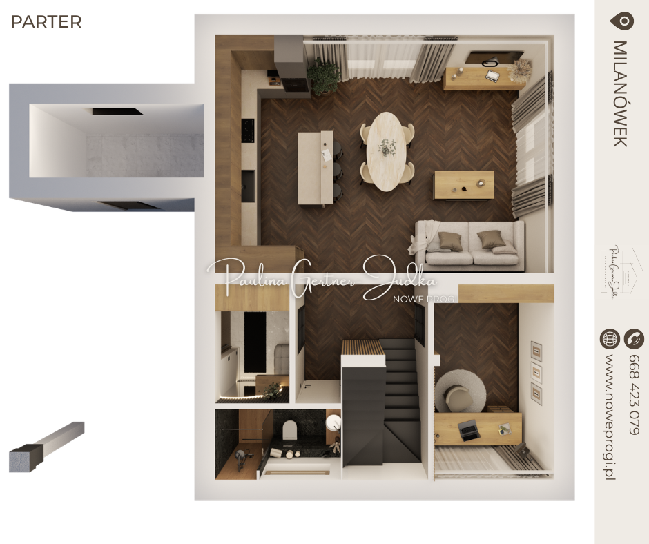 Dodatkowy pokój na parterze: Idealny na domowe biuro, w którym w końcu odetniesz się od hałasów kuchni, lub sypialnię gościnną dla rodziców, którzy zostaną na weekend.