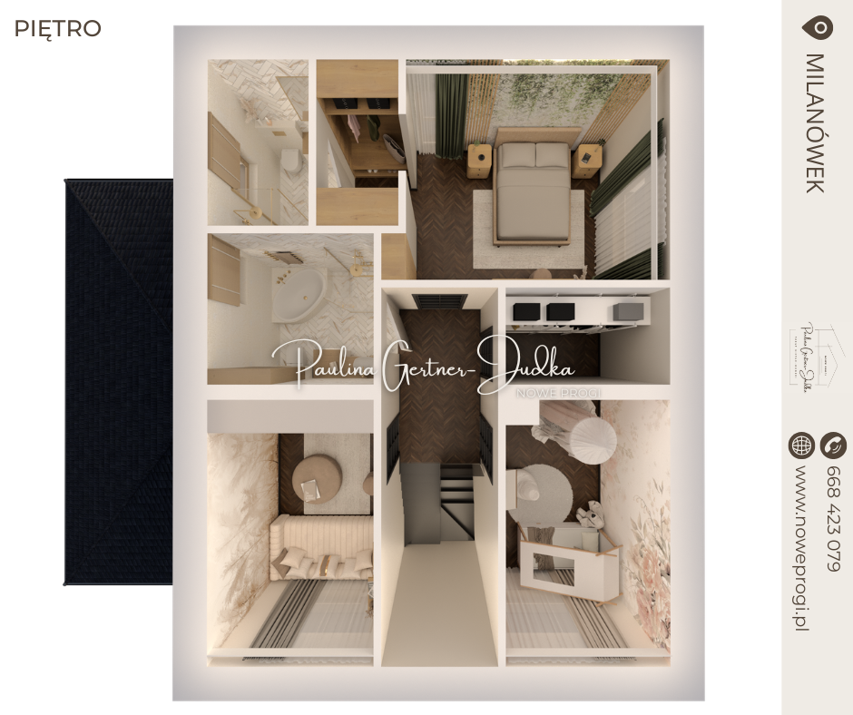 Piętro bez skosów: Zapomnij o uderzaniu głową w sufit. Piętro to pełna wysokość, co oznacza 100% ustawności pomieszczeń i poczucie ogromnej przestrzeni.